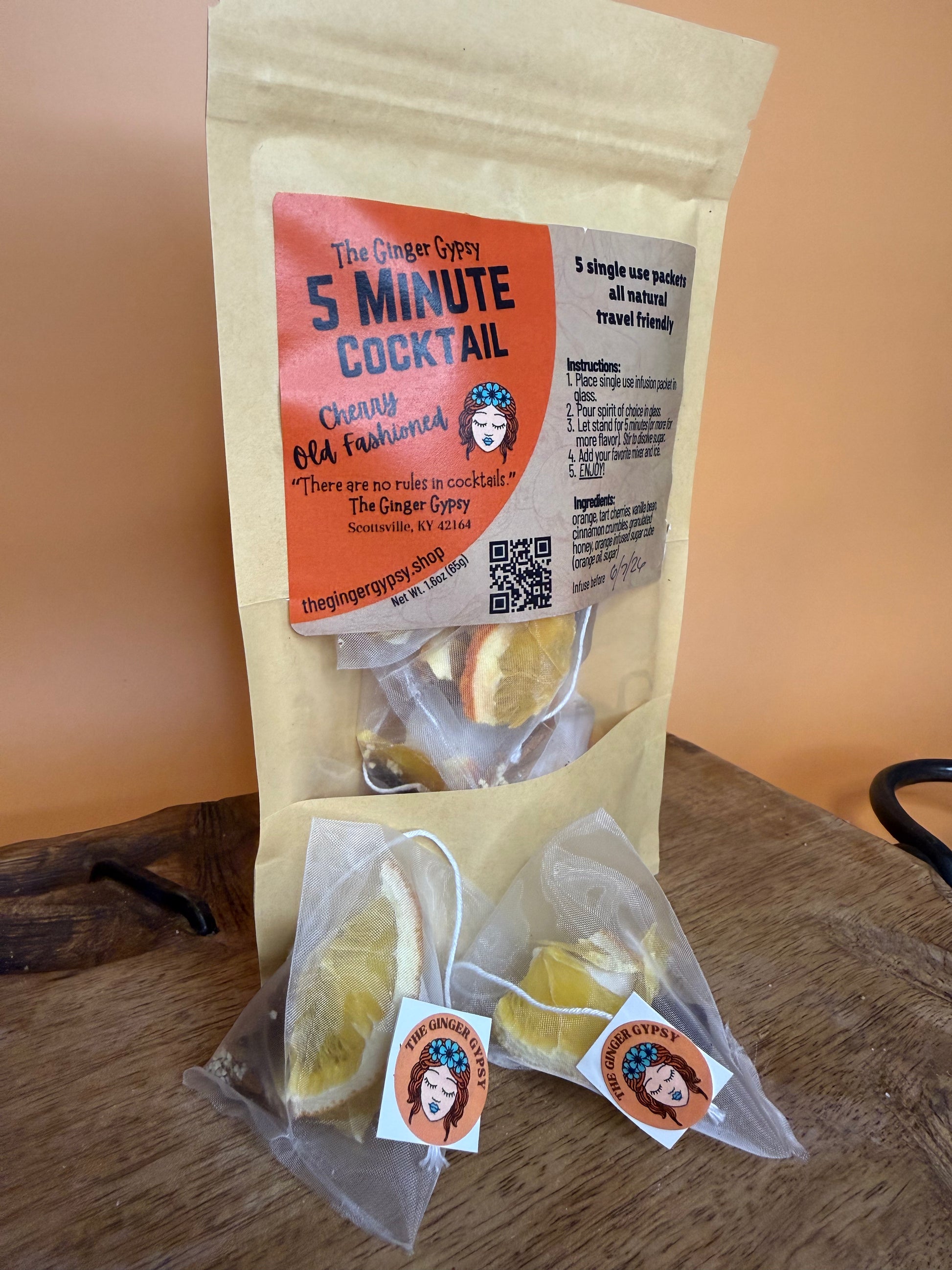 The Ginger Gypsy Cherry Old Fashioned 5-Minute Cocktail contains dried orange, cherries, vanilla bean, granulated honey, cinnamon crumbles and orange infused pure cane sugar.